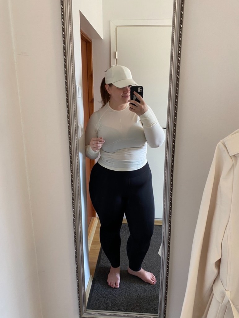 Since the sports pants have a very high waist and are a bit slim, wearing them together shows a beautiful hourglass figure.